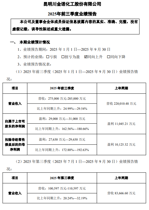 10月10日,川金诺(300505)(300505.SZ)发布业绩预告,2025年前三季度预计归属于上市公司股东的净利润为2.9亿元~3.1亿元,比上年同期上升162.56%~180.66%。2025年第三季度预计归属于上市公司股东的净利润为1.125亿~1.325亿元,比上年同期上升156.54%~202.15%。